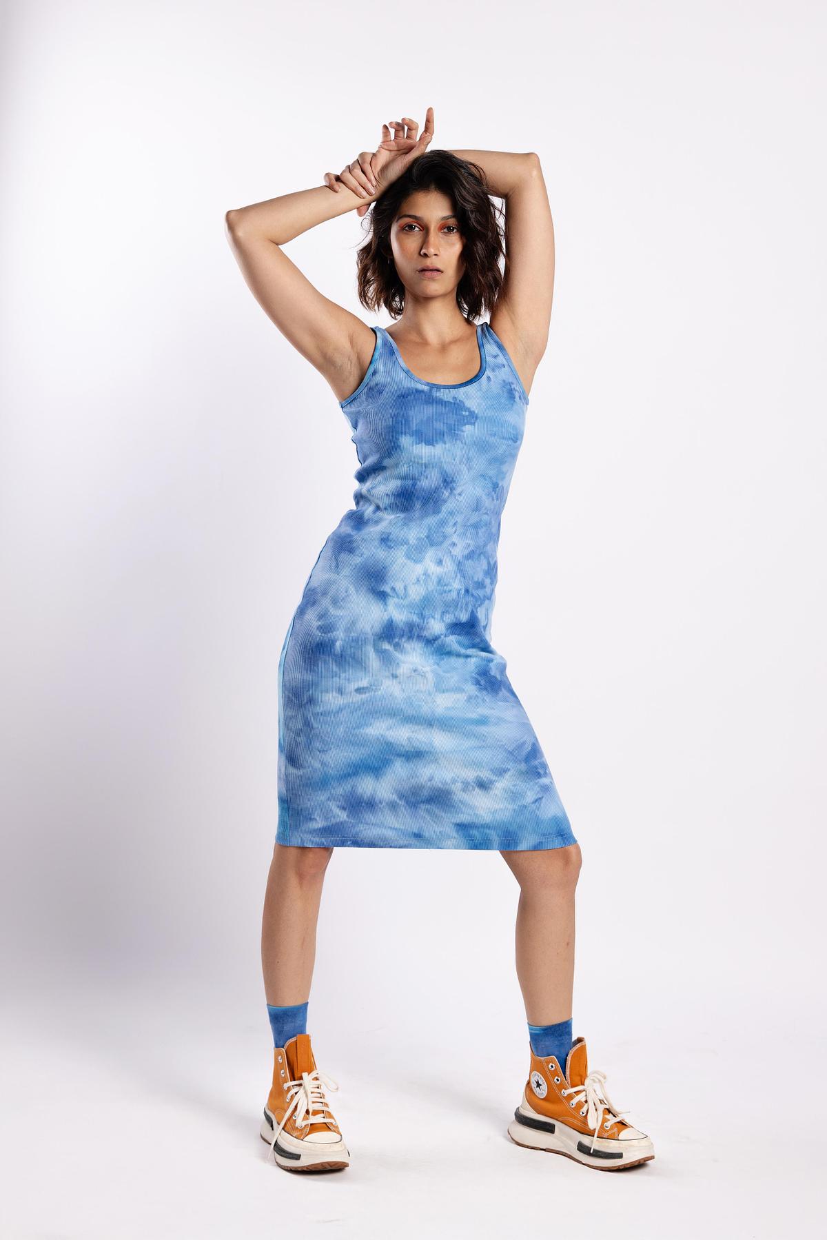 Meet the Summer Sky Hand-Dyed Ribbed Dress—a breathable, body-loving silhouette crafted in premium stretchable cotton rib. Each piece is individually hand-dyed, giving it a unique cloud-washed pattern inspired by clear summer skies.